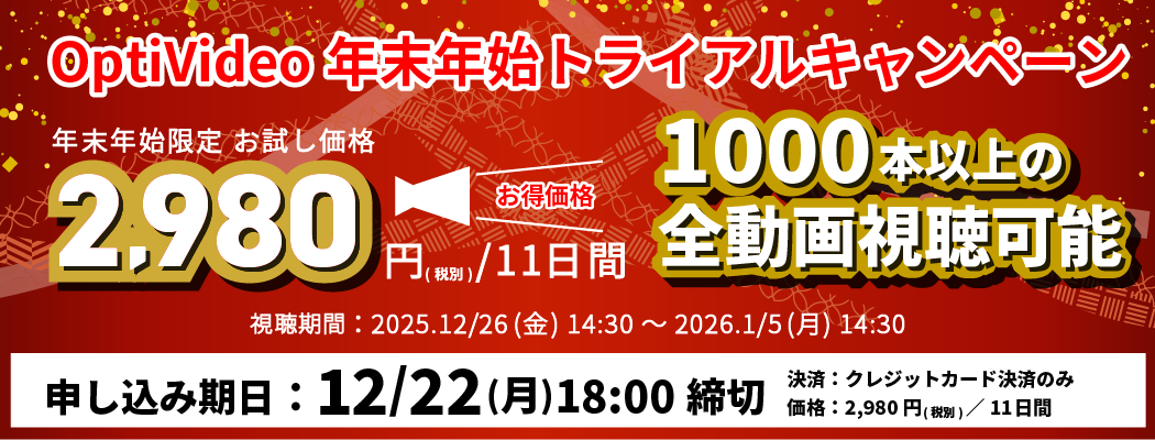 - 2024年12月20日:OptiVideo年末大感謝祭 人気講座980円キャンペーンのお知らせ